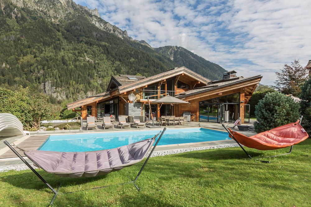 • Grand jardin et terrasse plein sud, piscine, jacuzzi, face au Mont-Blanc